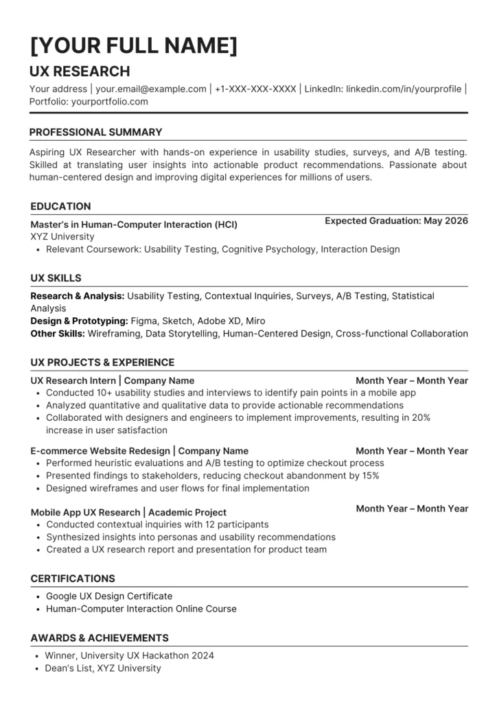 Master’s in Human-Computer Interaction | XYZ University | Expected Graduation: May 2026